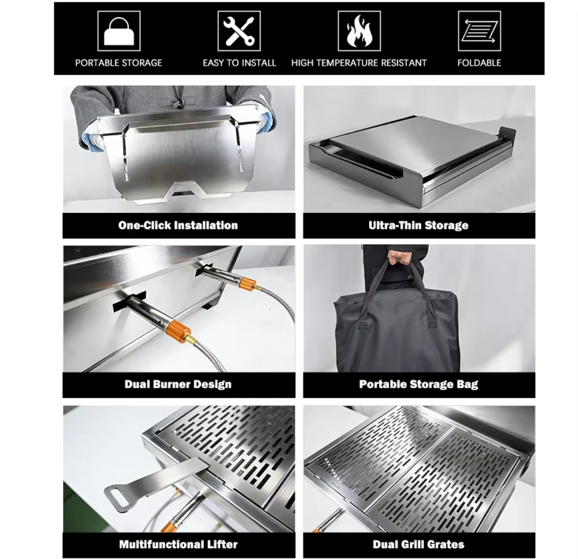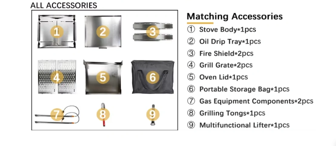 Special Features | One-button folding, independent fire control for dual burners, removable oven lid, removable double grill racks, removable large-capacity drip tray, rust-proof coating, laser engraving customization, standard storage bag (with compartments) |