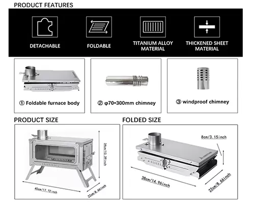 The adjustable baffle (chimney base) and detachable fire deflector work together to resist strong wind interference, maintain stable combustion, and ensure safety (preventing sparks from splashing and causing fires or burning equipment near the tent).
